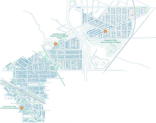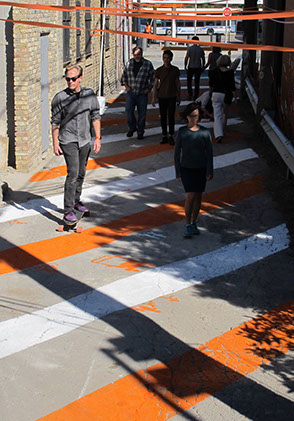 With support from the 45th Ward Alderman’s office, the National Endowment for the Arts and the Graham Foundation, the Good City Group (GCG) along with fellow artists and local residents, created this temporary alley installation in Jefferson Park, one of Chicago’s far Northwest neighborhood. This served as a launching event to map routes for the culture walks, from one neighborhood to another and to encourage residents to walk, ride, skip, slide the last mile from the public transportation hubs to their final destination.